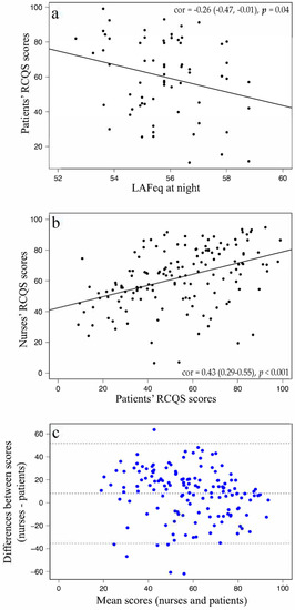 (a) RCSQ and mean sound levels at night; (b,c) nurses’ perception of patients’ sleep compared to the patients’ perception.