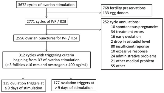 We conducted a retrospective analysis of a prospective database including women managed in the ART Unit of the Department of Gynaecology and Obstetrics of Tenon University Hospital, Paris (France) from December 2016 to July 2020. Among 3672 cycles of ovarian stimulation during the study period, we have selected all women undergoing a controlled ovarian stimulation (COS) for IVF/intracytoplasmic sperm injection-embryo transfer (IVF/ICSI-ET) (2771 cycles). Cancelled cycles have been excluded from the analysis. Among 2556 ovarian punctures for IVF/ICSI, criteria for triggering oocyte maturation by 7 or 8 days of treatment was achieved in 312 cycles. The criteria used to trigger oocyte maturation were the presence of at least three follicles >16 mm associated with oestrogen levels >400 pg/mL. We identified women for whom the decision to trigger ovulation was made as soon as the criteria were met (D ≤ 9 group), and those for whom treatments were prolonged by a few days aiming for better outcomes (D > 9 group). The decision on the day of ovulation trigger was made according to the ESHRE criteria which could have been adapted on an individual case basis depending on each practitioner’s experience and organizational factors in the ART unit.