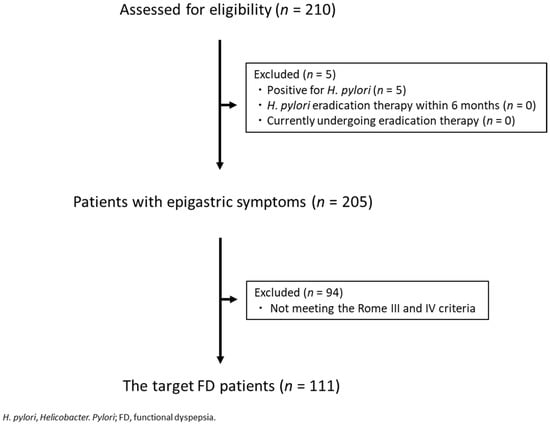 There were 210 patients who complained of epigastric symptoms, visited the outpatient department, and from whom a questionnaire could be collected. Of these, 5 were positive for H. pylori, 0 had undergone H. pylori eradication therapy within 6 months of initial consultation, and 0 were currently undergoing eradication therapy. There were no subjects who did not respond to the questionnaire, and a total of 205 patients, excluding 5 H. pylori-positive patients, were included in the final analysis. The target FD patients in the present study were 111 patients in whom FD could be diagnosed based on the Rome III and IV criteria (Figure 1). The prevalence of FD was 54.1% (111/205). The mean age of FD patients was 54.3 ± 14.9 years, and the male/female ratio was 35/76 (68.5% female). Patients’ characteristics are shown in Table 1.