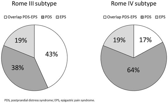 - Carbone, F.; Holvoet, L.; Tack, J. Rome III functional dyspepsia subdivision in PDS and EPS: Recognizing postprandial symptoms reduces overlap. Neurogastroenterol. Motil. 2015, 27, 1069–1074. [Google Scholar] [CrossRef]
