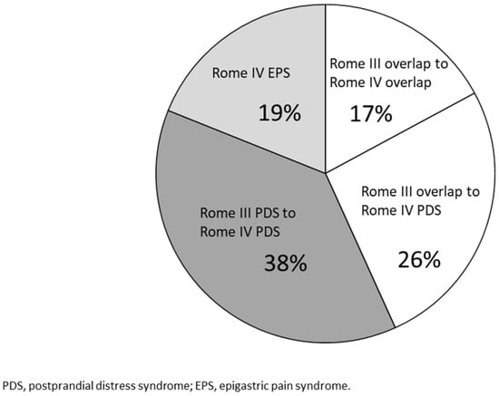 Of the 71 FD patients (64%) who received a diagnosis of PDS under the Rome IV criteria, 42 (38%) received a diagnosis of PDS based on both the Rome III criteria and IV criteria (PDS to PDS). Moreover, the classification of 29 patients (26%) changed from PDS and EPS under the Rome III criteria to PDS under the Rome IV criteria (overlap to PDS) (Figure 3).