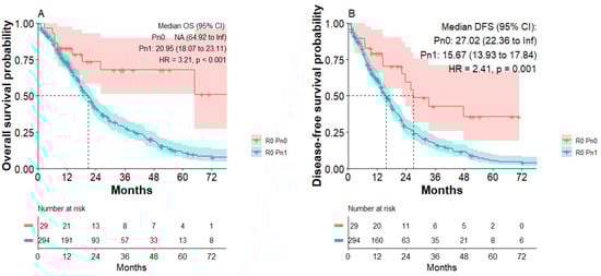 A total of 359/571 patients (62.9%) of the study population had tumor-free resection margins. Subgroup analysis of R0-resected patients indicated that most R0-resected patients presented with nerval invasion (R0 Pn1: 328/359; 91.4% versus R0 Pn0: 31/359; 8.6%). To investigate what impact PNI has on the disease-free survival and long-term survival of curative (R0)-resected PDAC patients, a Kaplan–Meier analysis of R0 patients was performed. Subgroup analysis of all R0-resected patients indicated improved disease-free survival of R0 Pn0 patients compared to R0 Pn1 patients. Median disease-free survival was 27 months in the R0 Pn0 group compared to 15.6 months in the R0 Pn1 group (HR: 2.41; p < 0.001, Figure 2B). R0 Pn0 patients also presented with improved overall survival compared to R0 Pn1 patients (Figure 2A). Median overall survival was 20.95 months in the R0 Pn1 group, whereas median survival in the R0 Pn0 group was not reached. We calculated a significantly increased risk for R0 Pn1 patients (HR: 3.21; p < 0.001) compared to R0 Pn0 patients.