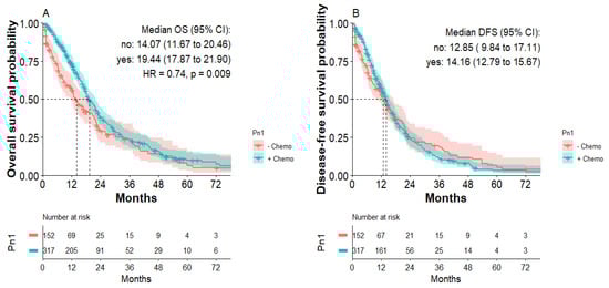 According to the Kaplan–Meier analysis, patients with Pn1 tumors receiving postoperative chemotherapy showed significantly improved overall survival. Median overall survival was 19.4 months for patients with Pn1 tumors with postoperative chemotherapy compared to 14.1 months for patients with Pn1 tumors without adjuvant chemotherapy (HR: 0.74; p = 0.009, Figure 3A). Median disease-free survival was 14.2 months for patients with Pn1 tumors with postoperative chemotherapy compared to 12.9 months for patients with Pn1 tumors without postoperative chemotherapy, not reaching significance (Figure 3B). Within the first 24 months after curative surgery, however, improved DFS was apparent for patients receiving postoperative chemotherapy. There were no significant differences in OS or DFS for patients with Pn0 tumors receiving postoperative chemotherapy (Supplementary Figure S3).