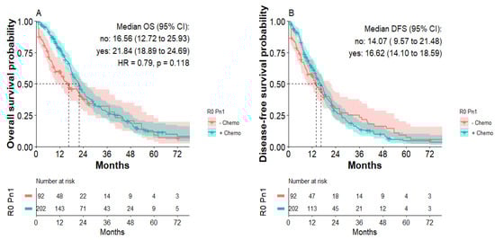Subgroup analysis of patients with R0 Pn1 tumors indicated that postoperative chemotherapy improved OS. Median overall survival was 21.8 months for patients with R0 Pn1 tumors with adjuvant chemotherapy compared to 16.6 months for patients with R0 Pn1 tumors without adjuvant chemotherapy, not reaching statistical significance (HR: 0.79; p = 0.11, Figure 4A). Median disease-free survival was 16.6 months for patients with R0 Pn1 tumors with postoperative chemotherapy compared to 14.1 months for patients with R0 Pn1 tumors without postoperative chemotherapy (Figure 4B). Again, focusing on first 24 months, improved DFS for R0 Pn1 patients receiving chemotherapy was detected without statistical significance.