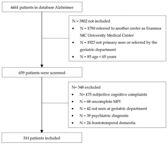 This study was a retrospective chart review study. All outpatients aged 65 years and older who were referred to the Alzheimer Center of the Erasmus MC University Medical Center, Rotterdam, from 1 January 2010 to 31 December 2020, and were primarily seen by a geriatrician were screened for inclusion in the study. Patients diagnosed with dementia or MCI after undergoing the standard workup were included. Exclusion criteria were a diagnosis of frontotemporal dementia (FTD), a psychiatric disorder and if data regarding calculating the MPI risk score was incomplete.