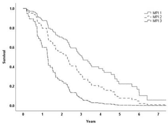 Seventy-one patients (22.8%) died during follow-up. After diagnosis, the average patient survival time was 2.5 years (from a minimum of 0.2 to a maximum of 10.4 years). Figure 2 shows the survival curve for the three MPI categories. The HRs and corresponding 95% CIs for mortality in patients in MPI category 2 and MPI category 3 were 1.67 (0.81–3.45) and 3.80 (1.56–9.24), respectively. When we combined patients in MPI categories 2 and 3, the HR for mortality was 3.98 (95% CI: 1.97—8.04, p < 0.001) compared to patients in MPI category 1.