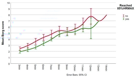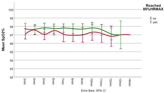 During CPET, non-achievers had lower test duration (p = 0.008), lower work rate (p = 0.002), lower VO2peak (p < 0.001), lower ventilatory efficiency (p = 0.007), and higher maximum Borg score (p = 0.026) (Table 1). Figure 1, Figure 2 and Figure 3 show the in-exercise mean values for Borg, SpO2% and rpm, respectively.