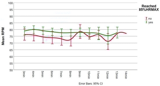 While mean predicted 85%HRmax was not too dissimilar for non-achievers and achievers (147 vs. 152 bpm, respectively, Table 1), on average non-achievers reached 84% (124 bpm) of their predicted 85%HRmax. Non-achievers seemed to experience higher intensity of perceived exertion during the test as evidenced by higher maximum Borg scores. Judging by the lack of overlap between 95% CIs, it appeared that lower mean Borg scores were present in achievers during minutes 5 and 6 (Figure 1). Specifically, baseline SpO2% values were normal and there were no significant desaturations (≥3%) during exercise in any of the two groups (Figure 2). Mean minute-by-minute rpm did not seem different between groups (Figure 3).