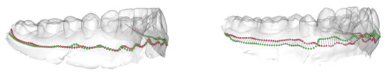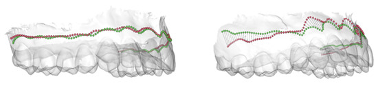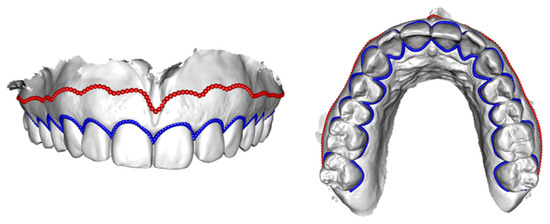 Two different curves, which indicate the course of the MT-BL and the MG-BL, were set on the IOS using the open-source software 3D Slicer [44] (see Figure 1b and Figure 2). The curves were set using sliding semi-landmarks [45] (see Figure 2). The MT-BL was set at the transition from mucous membrane to tooth using 560 semi-landmarks. The tip of the interdental papillae was marked additionally with one landmark from both buccal and oral side to capture the morphology of the MT-BL in detail. The MG-BL was set along the transition from attached to flexible mucosa using 150 semi-landmarks (see Figure 2). To minimize noise along the curves, landmarks were allowed to slide along the curves [45]. Furthermore, four identical anatomical landmarks were set on each of the surface scans and the corresponding digitized models for superimposition of the two surfaces later on.