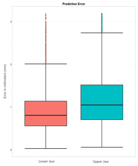 The median error for MG-BL reconstruction of the maxilla was 1.06 mm (0.49 mm–2.15 mm) (see boxplot in Figure 3). Figure 4 depicts the best (left side) and worst (right side) prediction of MG-BL.