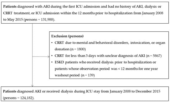 Patients with the following characteristics were excluded: (1) those who received CRRT due to mental and behavioral disorders, intoxication, or organ donation (n = 1800); (2) those who received CRRT for less than 3 days, which could not be confirmed as AKI because of the possibility of applying CRRT for other diseases such as drug intoxication (n = 5867); and (3) ESKD patients who received dialysis prior to hospitalization, or patients who had been observed for less than 12 months during a one-year washout period (n = 139). Finally, a total of 124,182 patients (73,512 men and 50,670 women) were included (Figure 1).