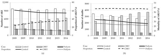 Yearly trends of acute kidney injury and in-hospital mortality according to renal replacement therapy modality: (a) Bars and lines represent the absolute numbers and the proportion of critically ill patients with AKI among all intensive care unit patients, respectively. The proportion of patients who received CRRT increased steadily from 24.1% in 2008 to 36.7% in 2014.; (b) Bars and lines represent the absolute number of deaths and the mortality of critically ill patients with AKI, respectively. In-hospital mortality rate of patients who received CRRT increased by 1% for 7 years (58.9% in 2008 to 59.7% in 2014).