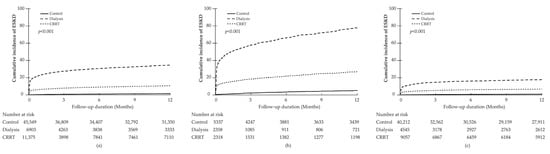 In all patients who were discharged, the median follow-up of AKI patients was 365 days (IQR 128–365 days). During the 47,141.1 person-years of follow-up period, 3433 (4.45%) patients progressed to ESKD (incidence rate 72.8/1000 person-years). The incidence rate of ESKD was higher in the dialysis and CRRT groups than in the control group (control vs. dialysis vs. CRRT groups; 16.2 vs. 463.8 vs. 126.5 per 1000 person-years). In the Kaplan–Meier survival analyses, the cumulative incidence of ESKD was significantly higher in the dialysis group than in the control and CRRT groups (log-rank test, p < 0.001) (Figure 3).