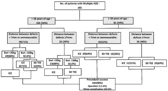 Summary of the echocardiographic tool selection strategy for patients with multiple atrial septal defects requiring transcatheter closure.ASD, atrial septal defect; Bwt, body weight; ICE, intracardiac echocardiography; RT 3D TTE, Real-time three-dimensional transesophageal echocardiography; TEE, transesophageal echocardiography.