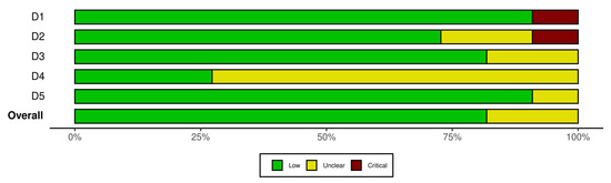 - McGuinness, L.A.; Higgins, J.P.T. Risk-of-bias VISualization (robvis): An R package and Shiny web app for visualizing risk-of-bias assessments. Res. Synth. Methods 2021, 12, 55–61. [Google Scholar] [CrossRef] [PubMed]