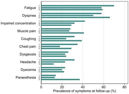 Prevalence of 10 most common symptoms at follow-up. Prevalence of each symptom is illustrated in 3 groups; (1) patients not requiring supplemental oxygen (2) patients requiring supplemental oxygen (3) patients admitted at ICU (3).