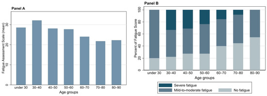 (Panel A) Graph bar showing the mean values of Fatigue Assessment Scale (FAS) by age groups. (Panel B) Graph bar showing the percent of patients with “Severe fatigue” (FAS score ≥ 35), “Mild-to-moderate fatigue (FAS score 22–34) and “No fatigue” (FAS score ≤ 21), by age groups.