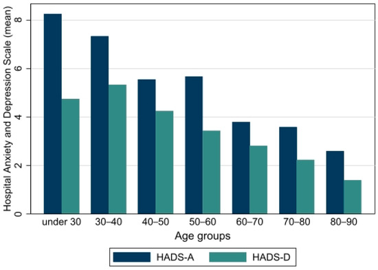 Mean scores from subscales on anxiety (HADS-A) and depression (HADS-D) in Hospital Anxiety and Depression Scale (HADS), by age groups. A score ≥ 8 identifies cases.
