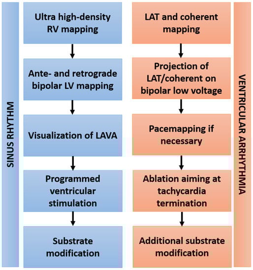 Transseptal puncture was performed using a BRK-1 needle and a steerable sheath with electrodes allowing its visualization inside the 3D mapping system (8.5 Fr, ViziGo, large curve, Biosense Webster, Inc., Diamond Bar, Irvine, CA, USA). Two diagnostic catheters were introduced and positioned into the coronary sinus (6 Fr, Webster, Biosense Webster, Inc., Diamond Bar, Irvine, CA, USA) and the right ventricle (5 Fr, Webster, Biosense Webster, Inc., Diamond Bar, Irvine, CA, USA). Right and left ventricular ultrahigh-density mapping was conducted in all patients using a 3D electroanatomic mapping system (CARTO PRIME Mapping module, Biosense Webster, Irvine, CA, USA) aiming >1000 mapping points. Bipolar voltage mapping of the left ventricle was conducted during sinus rhythm, intrinsic atrial rhythm or ventricular pacing by ante- and retrograde access with a multielectrode catheter (PENTARAY, Biosense Webster). Epicardial access was assessed by dry epicardial puncture with conventional needles if the clinical VA was morphologically suspected to be of epicardial origin, or in case of ineffective endocardial ablation attempts. A steerable sheath (Agilis Epi, St. Jude Medical, Saint Paul, MN, USA) was inserted into the epicardial space. Low-voltage areas were defined as bipolar voltage of <1.5 mV in endocardial mapping and 5–8 mV in epicardial mapping. Programmed ventricular stimulation was performed before ablation in all patients for tachycardia induction. Catheter ablation targeted induced VA as well as substrate modification of abnormal intracardiac EGMs based on high-density mapping. Local abnormal ventricular activity (LAVA) was defined according to previously published criteria [15]. If VA was inducible and hemodynamically tolerated, then local activation time (LAT) mapping and a novel vector-based mapping algorithm (CARTO Coherent module, Biosense Webster) were implemented to analyze arrhythmia propagation. In case of focal tachycardia patterns, the location of earliest activation was targeted for ablation. In cases with underlying re-entrant mechanisms, zones of slow conduction based on coherent mapping were ablated. Pace mapping of induced and clinical VA was performed using an automated VA-template-matching algorithm (CARTO PASO module, Biosense Webster). Radiofrequency ablation was delivered in a power-controlled mode with a maximum of 40 W, a maximum temperature of 43 °C and a low rate of 30 mL/min using an open, irrigated-tip ablation catheter (ThermoCool, Biosense Webster, Inc., Diamond Bar, Irvine, CA, USA). The primary procedural endpoint was the non-inducibility of any sustained VA at the end of the procedure, defined as complete success. Non-inducibility of the clinical VA was defined as partial success. Elimination of all LAVA was defined as the procedural endpoint in terms of substrate modification. The ablation workflow is depicted in Figure 1.