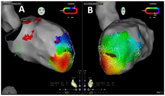 Representative image of velocity-vector-based coherent mapping for ventricular arrhythmia propagation mapping in RAO (A) and LA (B) projections.