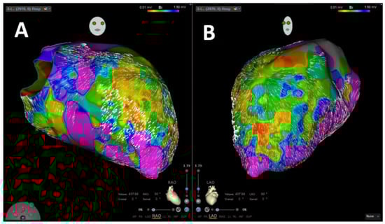Representative image of left ventricular velocity-vector-based coherent mapping in combination to bipolar voltage mapping in RAO (A) and LAO (B) projections.