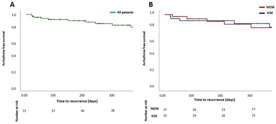 Survival analysis using the Kaplan–Meier method showed an arrhythmia-free survival of 85.1 ± 4.7% after 12 months for all patients (Figure 4A). In patients with ICM, arrhythmia-free survival was 87.6 ± 5.9% after 12 months, and in patients with NICM, arrhythmia-free survival was 81.9 ± 7.6% after 12 months (Figure 4B). A significant difference between arrhythmia recurrence in ICM or NICM was not observed (p = 0.737)