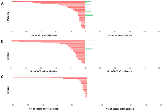 Burden of VA (A), ATP (B) and ICD shock delivery (C), displayed for each patient during 6 months before ablation and 6 months after ablation. Each patient is represented by a single line arranged from highest number of episodes to lowest. The upper values for events have been cut at 50. A significant reduction in mean number of VA, ATP and ICD shocks could be observed. VT—ventricular tachycardia; ATP—anti-tachycardia pacing; No.—number.
