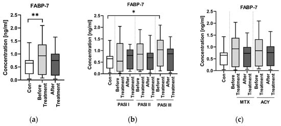 - Baran, A.; Kiluk, P.; Maciaszek, M.; Świderska, M.; Flisiak, I. Liver fatty acid-binding protein might be a predictive marker of clinical response to systemic treatment in psoriasis. Arch. Dermatol. Res. 2019, 311, 389–397. [Google Scholar] [CrossRef]