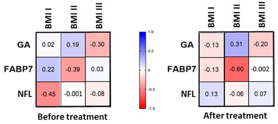 | FABP-7 | 0.03 0.837 | 0.08 0.579 | 0.05 0.701 | −0.02 0.873 | −0.01 0.949 | −0.01 0.964 | −0.24 0.086 | 0.05 0.737 | 0.08 0.981 |