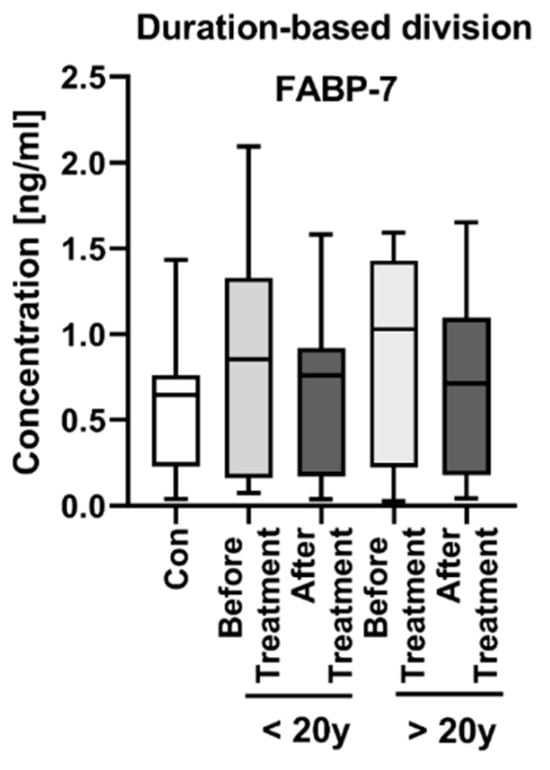 - Teunissen, C.E.; Veerhuis, R.; De Vente, J.; Verhey, F.R.J.; Vreeling, F.; Van Boxtel, M.P.J.; Glatz, J.F.C.; Pelsers, M.A.L. Brain-specific fatty acid-binding protein is elevated in serum of patients with dementia-related diseases. Eur. J. Neurol. 2011, 18, 865–871. [Google Scholar] [CrossRef]