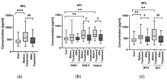 - Okan, G.; Baki, A.M.; Yorulmaz, E.; Doğru-Abbasoğlu, S.; Vural, P. A preliminary study about neurofilament light chain and tau protein levels in psoriasis: Correlation with disease severity. J. Clin. Lab. Anal. 2021, 35, e23564. [Google Scholar] [CrossRef] [PubMed]