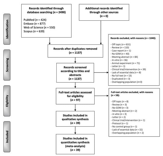 The flow diagram (Figure 1) depicts the identification and selection process of studies. We retrieved a total of 2490 records published before 14 April 2021: 424 from MEDLINE/PubMed, 877 from Embase, 550 from the Web of Science, and 639 from Scopus. After eliminating duplicates, 1137 studies were considered potentially eligible (all the studies excluded and their exclusion criteria are listed in Figure 1). After screening their titles and abstracts, 97 were selected for full-text reading. After excluding studies that did not meet all eligibility criteria, 39 studies were finally included in the review for qualitative evaluation and quantitative meta-analysis.