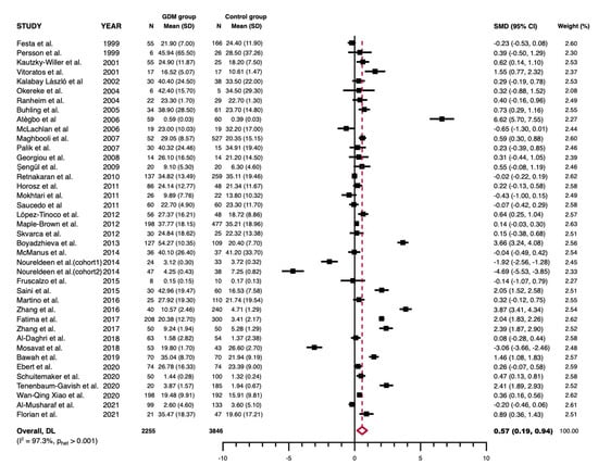 Meta-analysis on leptin levels in GDM. Leptin levels were significantly higher in GDM participants than in controls (SMD = 0.57, 95%CI = 0.19 to 0.94; p < 0.001). Significant heterogeneity was observed (p < 0.001; I2 = 97.3%) (Figure 2, Table 3).