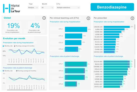 Raw data extractions from the EMRs were loaded into a dashboard (Power BI, Microsoft Corporation, Redmond, Washington, DC, USA) on a monthly basis. The exports consisted of separate tables for the prescriptions of different types of medical acts (prescription of drugs, laboratory tests). The raw data were processed according to a predefined data model. More specifically, the data from the different raw tables were combined into a single prescription table and the relationship between prescriptions and time was established based on the end date of each medical care episode, i.e., when dashboard users filtered the dashboard by a specific time period, the prescription information would be adjusted to all episodes whose end dates were in the given time frame. The update of the data in the dashboard was performed manually once per month. The dashboard was made available on an internet platform accessible only to hospital staff who had been granted access rights beforehand. It was therefore possible to consult the dashboard at any time of the day with an internet connection and the hospital’s VPN.