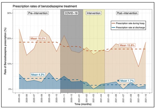 Evolution of the proportion of patients with a benzodiazepine prescription between the investigated periods. * Indicates a significant difference between the pre- and post-intervention prescription rate.
