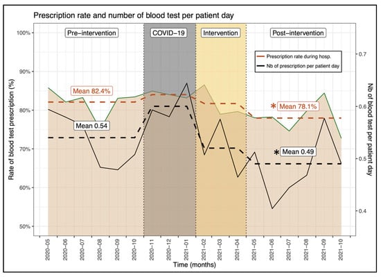 The proportion of patients who underwent at least one blood test during the hospital stay was significantly reduced by more than 4% in the post-intervention period (pre: 82.4% vs. post: 78.1%, p = 0.011) (Table 1, Figure 3). This significant difference could also be noted on physician’s prescription rate (pre: 82.1% ± 22.2% vs. post: 78.4% ± 21.1%, p = 0.035). The multivariate analysis confirmed that prescription of at least one blood test was significantly lower after the intervention compared to the pre-intervention period (OR, 0.68, 95% CI, 0.54–0.85, p < 0.001), independently from patient age, sex, length of stay and patient clinical complexity level. Among them, the number of blood tests per hospitalization day was also significantly reduced in the post-intervention phase by 0.05 (pre: 0.54 ± 0.43 vs. post: 0.49 ± 0.60, p = <0.001). This result was also confirmed by the multivariate analysis (beta, −0.05, 95% CI, −0.10–0.01, p = 0.023). This difference is almost equivalent to a reduction of one blood test every two hospitalizations considering our average length of stay of 9 days (−0.05 × 2 × 9 = −0.9).