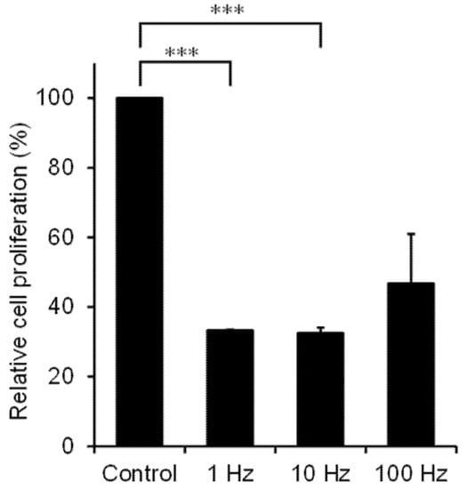 We conducted cell proliferation experiments to investigate the cell proliferation inhibitory effect of US irradiation on TRAMP-C2 cells. Cell proliferation assays showed that US irradiation significantly suppressed cell growth by 65% at 1 Hz (p < 0.0001) and 10 Hz (p < 0.0001). US irradiation at 100 Hz showed a cell proliferation inhibitory effect of about 50%, but no statistically significant difference was obtained (Figure 2).