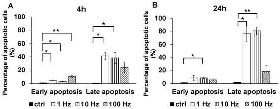Apoptosis detection experiments were conducted to verify that the cell proliferation inhibitory effect of US irradiation was caused by the induction of apoptosis. Four hours after US irradiation, early phase apoptosis was significantly induced at 1, 10, and 100 Hz compared to controls (p = 0.0129, p = 0.0150, and p = 0.0017, respectively), and late phase apoptosis was significantly induced at 1 and 10 Hz compared to controls (p = 0.0203 and p = 0.0468, respectively) (Figure 3A). Twenty-four hours after US irradiation, early phase apoptosis was significantly induced at 10 Hz (p = 0.0308), and late phase apoptosis was significantly induced at 1 and 10 Hz (p = 0.0277 and p = 0.0055, respectively) compared to controls (Figure 3B).