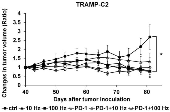 The therapeutic effects of US irradiation and ICIs were investigated in vivo using TRAMP-C2-bearing mice. No skin damage due to US irradiation was observed. In the animal experiments, on the 41st day after the start of irradiation a tumor growth inhibitory effect of about 75% was observed with 10 and 100 Hz of US irradiation and the combined use of US irradiation at 100 Hz and anti-PD-1 antibody compared to controls (Figure 4).