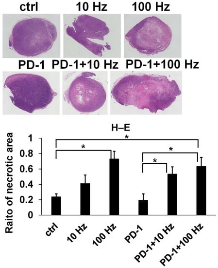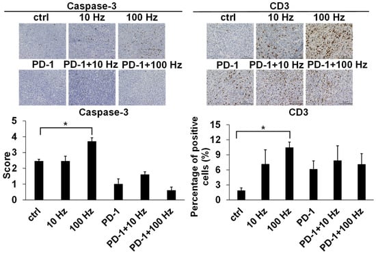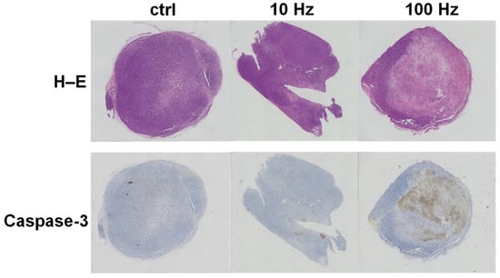Mouse tumors were examined for the in vivo inhibition of US and ICIs. The caspase-3 final score range were 2.45 ± 0.13, 2.45 ± 0.32, 3.7 ± 0.24, 1.00 ± 0.34, 1.6 ± 0.18, and 0.6 ± 0.21 (ctrl, 10 Hz, 100 Hz, ICIs, ICIs + 10 Hz, and ICIs + 100 Hz, respectively); the percentage of CD3 positive cells were 1.85 ± 0.54%, 7.12 ± 2.87%, 10.44 ± 1.11%, 6.11 ± 1.67%, 7.83 ± 2.97%, and 7.08 ± 2.16% (ctrl, 10 Hz, 100 Hz, ICIs, ICIs + 10 Hz, and ICIs + 100 Hz, respectively). Assessed by IHC staining, the expression level of cleaved Caspase-3 was about 1.5 times higher at 100 Hz than that of the controls (p = 0.0294) (Figure 5). In other words, US irradiation significantly induced apoptosis even in vivo. In addition, the proportion of CD3-positive cells significantly increased at 100 Hz by about 5.7 times compared to controls (p = 0.0349) (Figure 5). Assessed by H–E staining, the necrotic area of the tumor increased about 3.2 times at 100 Hz compared to controls (p = 0.0141) (Figure 6). The necrotic part of the tumor increased significantly with combined treatment by anti-PD-1 antibody and US irradiation (10 and 100 Hz) as compared with anti-PD-1 antibody monotherapy (p = 0.0339 and p = 0.0224) (Figure 6). Furthermore, when the overall image of the H–E-stained tissue and the IHC stained tissue with cleaved Caspase-3 were compared, the necrotic areas and cleaved Caspase-3 positive areas were almost the same (Figure 7).
