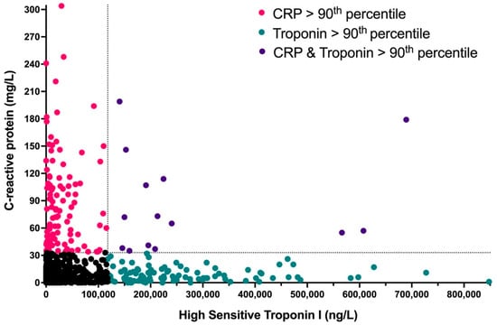 Combined CRP and Troponin Test (CTT) results. A scatterplot of the study population according to their second CRP and cardiac troponin test results. The dotted lines represent the 90th percentile thresholds (CRP > 33 mg/L and cardiac troponin > 118,000 ng/L) according to our CHIAD analysis as described in the Methods section.