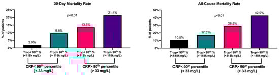 Patients with high CRP concentrations (above the 90th percentile, >33mg/L) had higher 30-day and all-cause mortality rates regardless of their troponin test status (above or below 118,000 ng/L); 14.4% vs. 2.7%, p < 0.01 (Figure 2). However, patients with both high CRP and high troponin levels had the highest mortality rates compared to the rest of the cohort; 21.4% vs. 3.7%, p < 0.01 (Figure 2). We also assessed all-cause mortality after a median follow-up of 4.5 years [IQR 3.1–6.3] and observed a similar trend across all CTT test result categories (Figure 2). Patients with both high CRP and high troponin levels on their second measurement had the highest mortality rates compared to the rest of the cohort; 42.9% vs. 12.7%, p < 0.01 (Figure 2).