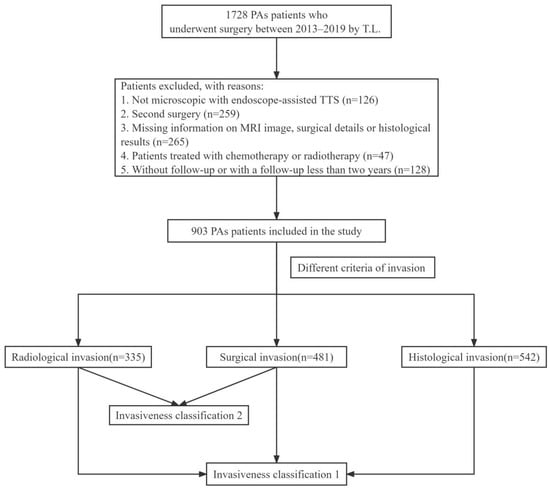 We retrospectively assessed data from patients with PAs who underwent transnasal-transsphenoidal surgery (TTS) at Tongji Hospital between January 2013 and December 2019. Inclusion criteria were as follows: (1) patients with histologically confirmed PAs; (2) patients who underwent microscopic, endoscope-assisted TTS; (3) those who underwent surgery performed by the experienced pituitary surgeon, T.L., and (4) those who were followed up post-surgery for more than 2 years. The following patients were excluded from the analysis: (1) those who did not undergo follow-up evaluations; (2) those who underwent a second surgery during hospitalization; (3) those with no data related to PA invasiveness, and (4) those treated with chemotherapy or radiotherapy. In total, 903 patients (396 female and 507 male) were included in the study. A flowchart summarizing the enrollment strategy and study design is shown in Figure 1.