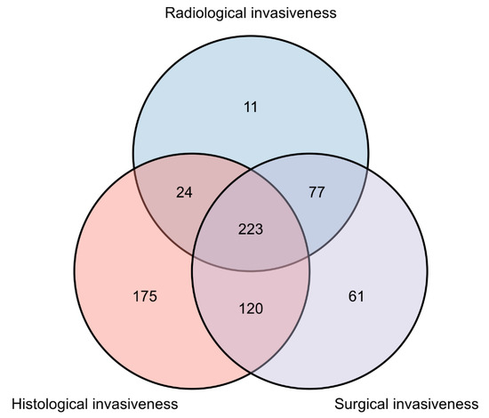 Venn chart illustrating the number and interactive information of patients with radiological, surgical, and histological invasiveness.