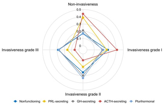 Radar chart illustrating the proportional distribution of invasiveness for different clinical subtypes. PRL: Prolactin; GH: Growth Hormone; ACTH: Adrenocorticotropic Hormone.