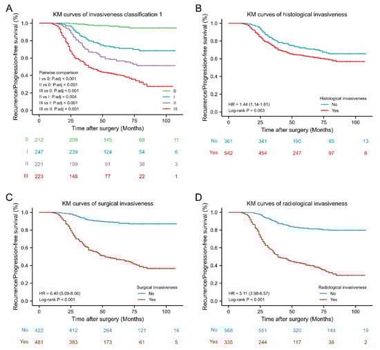 Kaplan–Meier survival curves of different invasiveness groups. (A) Kaplan–Meier survival curves of invasiveness classification 1. (B) Kaplan–Meier survival curves of histological invasiveness. (C) Kaplan–Meier survival curves of surgical invasiveness. (D) Kaplan–Meier survival curves of radiological invasiveness. KM: Kaplan–Meier; HR: Hazard Ratio.