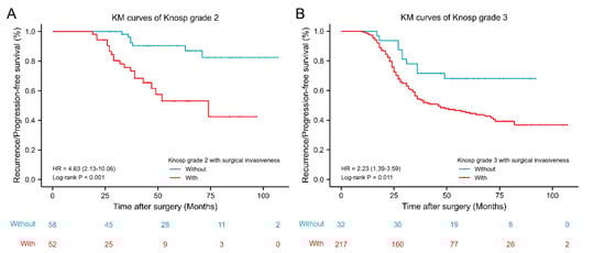 Kaplan–Meier survival curves of Knosp grade 2–3 with or without surgical invasiveness. (A) Kaplan–Meier survival curves of Knosp grade 2 with or without surgical invasiveness. (B) Kaplan–Meier survival curves of Knosp grade 3 with or without surgical invasiveness. KM: Kaplan–Meier; HR, Hazard Ratio.