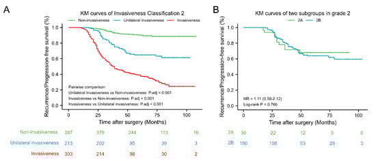 Kaplan–Meier survival analysis of Invasion Classification 2. (A) Kaplan–Meier survival curves of Invasion Classification 2. (B) Kaplan–Meier survival curves of two subgroups in grade 2. Non-invasiveness: Invasion Classification grade 0–1; Unilateral invasiveness: Invasion Classification grade 2; Invasiveness: Invasion Classification grade 3–4; 2A: Knosp grade 3 PAs without surgical invasiveness; 2B: Knosp grade 0–2 PAs with surgical invasiveness. KM: Kaplan–Meier; HR, Hazard Ratio.