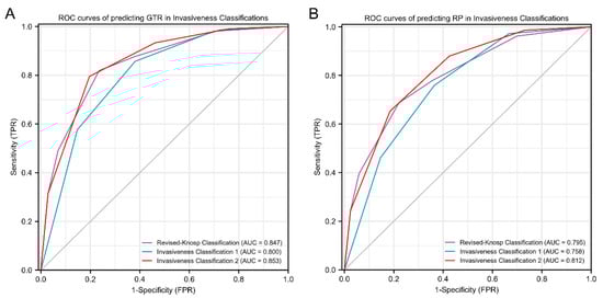 ROC curves for predicting surgical outcome and recurrence/progression status, using Knosp classification, Invasiveness Classification 1, and Invasiveness Classification 2, are shown in Figure 8. We found that both Invasiveness Classification 2 and revised-Knosp classification could accurately predict GTR (area under the curve (AUC) 0.853 and AUC 0.847, respectively; p = 0.353), which were better than Invasiveness Classification 1 (AUC 0.800; p < 0.001 and p < 0.001, respectively). Furthermore, Invasiveness Classification 2 most accurately predicted RPFS (AUC 0.812), followed by revised-Knosp classification, which was also an accurate predictor (AUC 0.795, p = 0.044). Invasiveness Classification 1 was the poorest predictor of RPFS (AUC 0.758; p < 0.001 and p = 0.002, respectively).