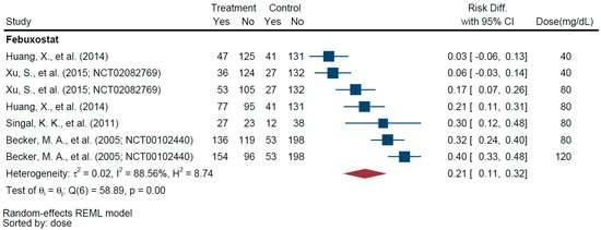 The present meta-analysis showed that febuxostat had better SUA-lowering ability than allopurinol or topiroxostat (Table 1). Based on the null model, the expected SUA-lowering effect of allopurinol 300 mg was a 15% reduction from the baseline SUA level. Based on our SUA-lowering analysis, an equivalent outcome would be achieved by febuxostat 83.33 mg or topiroxostat 150 mg (Table 2, Table 3 and Table 4). Previous meta-analyses that examined the comparative efficacy of ULT drugs showed similar AD results as in the present study. Ye et al. [68] report that the efficacy of febuxostat 40 mg daily is higher than that of allopurinol 100–300 mg daily and is greater with higher doses (80–120 mg daily). Borghi et al. [69] showed that doses of febuxostat >40 mg daily are superior to allopurinol at 300 mg daily. Furthermore, Li et al. [70] suggested that febuxostat has greater efficacy at 120 mg daily compared to allopurinol at 300 mg daily. Based on our AD analysis results (Table 5), febuxostat 80 mg daily may be a better treatment option than allopurinol for patients with refractory SUA levels, consistent with 2016 EULAR and 2020 ACR recommendations [20,21].